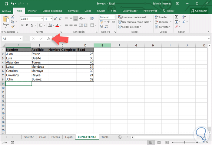 2. Usar función Concatenar en Excel 2016