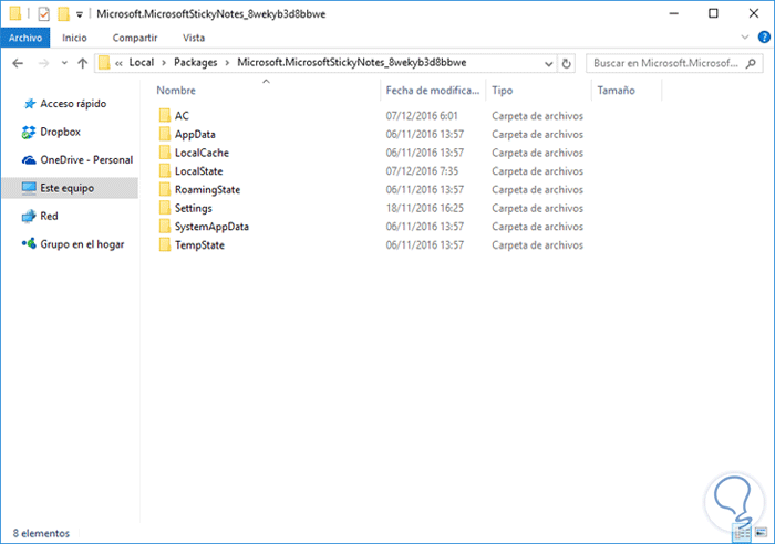 C:\Users\Usuario\AppData\Local\Packages\Microsoft.MicrosoftStickyNotes_8wekyb3d8bbweVeremos las siguientes carpetas en dicha ruta: