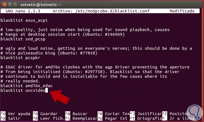 Para esta tarea debemos añadir el driver de la webcam a la “lista negra” del sistema y para ello debemos editar el archivo blacklist.conf usando el editor preferido, en este caso usaremos el siguiente comando: