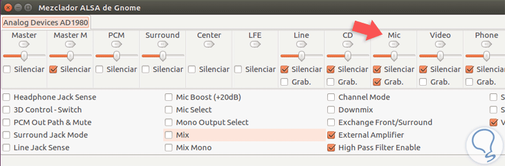 Para deshabilitar o activar el micrófono en Ubuntu debemos ir a la ficha Mic y dejar activa la casilla Silenciar y desmarcar la casilla Grab. De manera automática la herramienta guardara los cambios. Si lo que queréis es habilitar el micrófono, sería al revés de lo comentado.