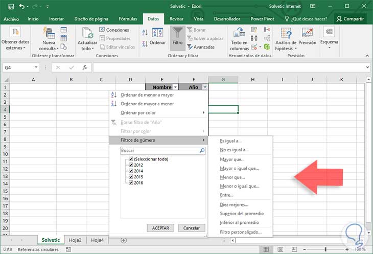 • Filtros de numero mediante el cual contamos con una serie de opciones para la visualización de los resultados)