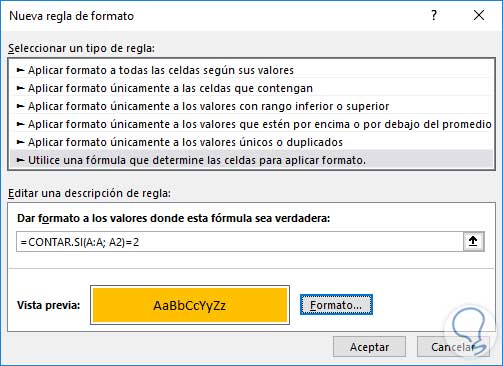 • En el campo Vista previa seleccionamos el formato que tendrán las celdas que cumplan estos valores