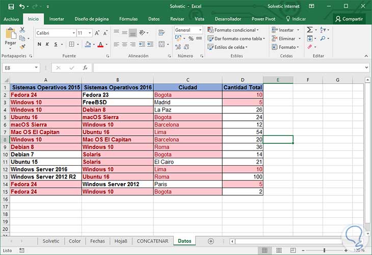 Vamos a buscar los sistemas operativos que han sido distribuidos de manera consecutiva en los años 2015 (Columna A) y 2016 (Columna B). Aunque a simple vista detectamos los sistemas operativos repetidos podemos aplicar una fórmula para que la vista sea mucho más completa y con un aspecto más profesional.