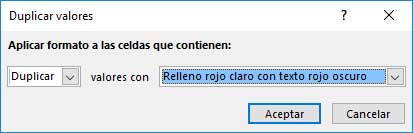 En esta ventana debemos definir qué tipo de formato hemos de aplicar a los valores duplicados en el rango seleccionado. Debemos tener presente dos aspectos: