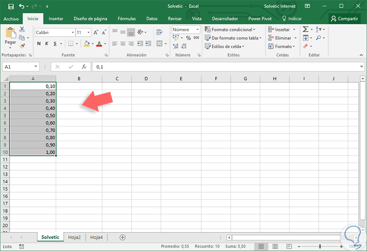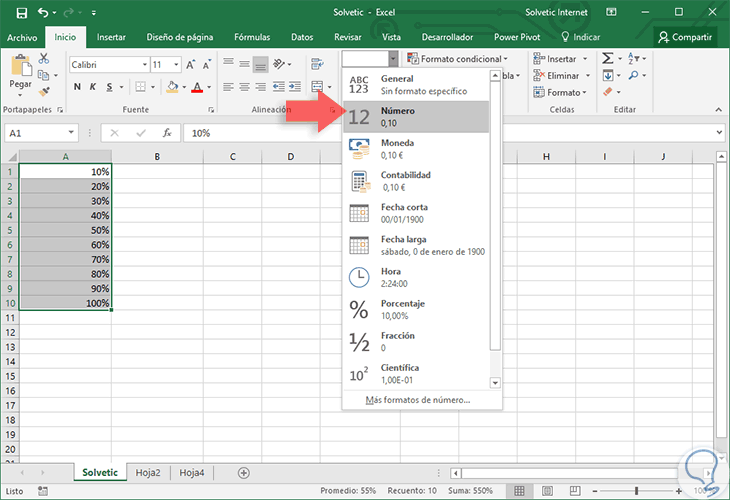 Si seleccionamos el rango de valores y le aplicamos el formato de Número desde el grupo Número veremos lo siguiente: