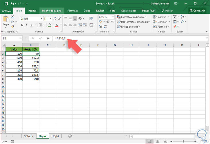 El valor por el cual haremos la resta lo obtenemos de la resta del 100% menos el porcentaje a disminuir del valor original. Por ejemplo, si deseamos restar el 30% del valor, haremos la multiplicación por 0.70 el cual es el resultado de la operación (100-30) / 100. Por ende, usaremos la siguiente formula: