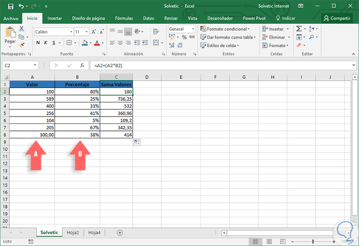 El propósito es que a los valores de la columna A añadiremos los porcentajes de la columna B. Para ello usaremos la siguiente formula: