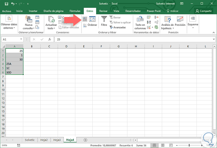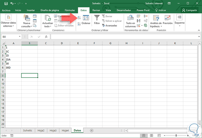 Para comprender como Excel 2016 diferencia entre los respectivos valores trataremos de ordenar estos valores usando la forma tradicional seleccionando el rango de celdas y dirigiéndonos a la pestaña Datos, grupo Ordenar y filtrar y allí seleccionando la opción Ordenar de A a Z.