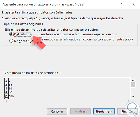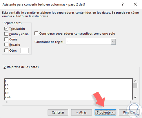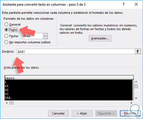 En esta ventana dejamos nuevamente la opción por defecto y pulsamos Siguiente y se desplegara la siguiente ventana donde debemos activar la casilla Texto ubicada en el campo Formato de los datos en columnas.