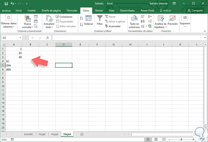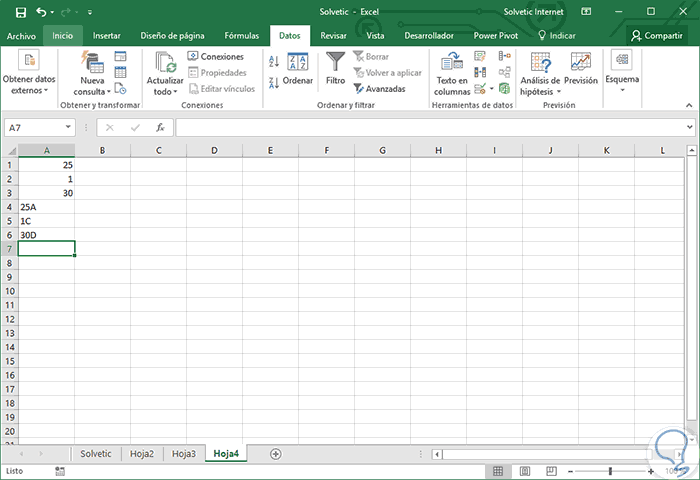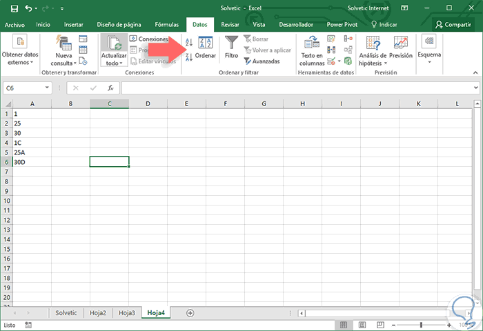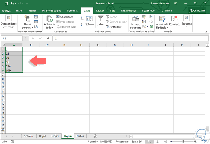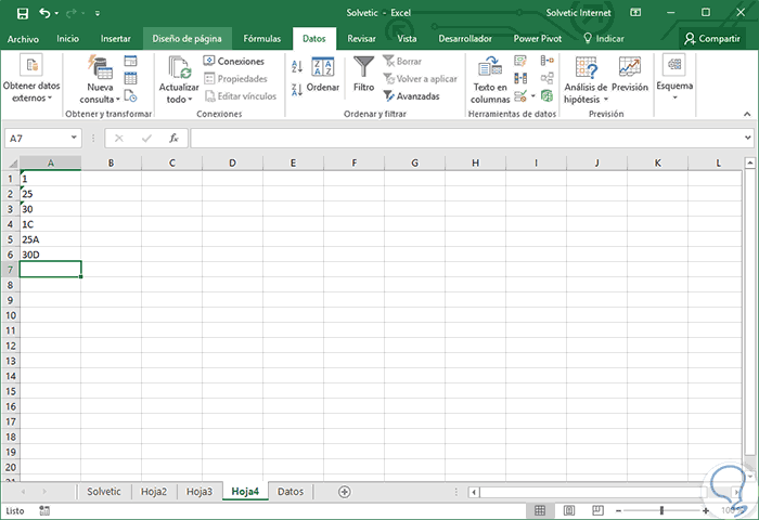Podemos ver que Excel 2016 ordeno primero los valores numéricos y luego las cadenas de texto. Aunque los datos están ordenados de forma ascendente no está según el criterio que necesitamos, para ello debemos convertir los valores numéricos en cadenas de texto.