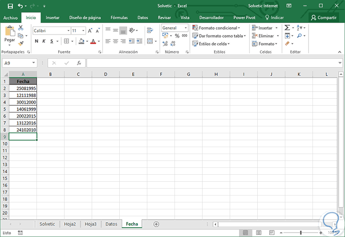 Recordemos que en Excel 2016 la fecha está formada por día, mes y año sin excepción alguna. Tenemos los siguientes datos.