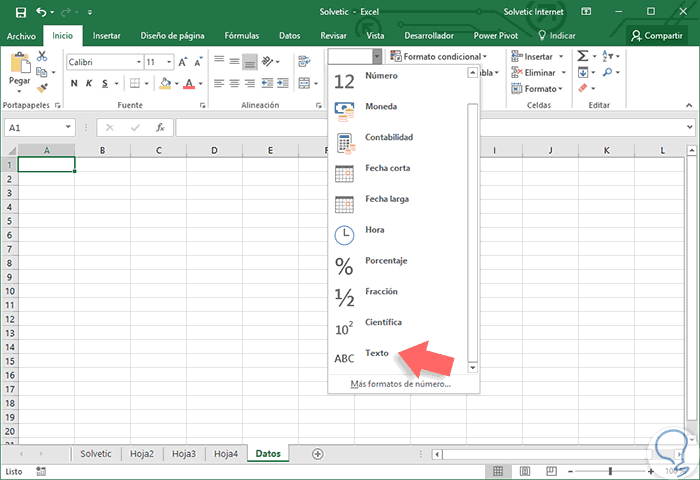 Otra de las alternativas que nos ofrece Excel 2016 es usar el comando texto para modificar el formato de dichos valores.
