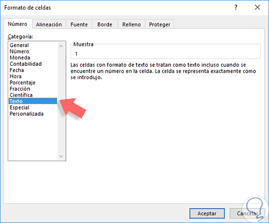 2. Convertir números en texto cambiando formato de celda en Excel 2016