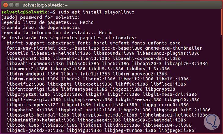 sudo apt install playonlinuxRecordemos que PlayOnLinux está disponible en todos los repositorios de las distros actuales. Esperamos que todos los paquetes sean descargados e instalados en el sistema.
