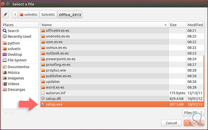 Una vez ubicada la carpeta donde tenemos Office 2013 seleccionamos el archivo setup.exe y pulsamos la opción Open