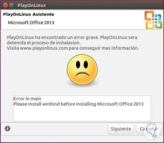 Este es un mensaje acerca de la configuración inicial de PlayOnLinux por lo cual pulsamos en Siguiente para continuar con el proceso de instalación. En algunas ocasiones podemos tener el siguiente error: