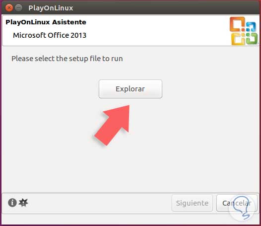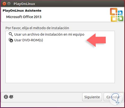 Allí debemos elegir el medio por el cual hemos de realizar la instalación de Office 2013 en Ubuntu, podemos usar un CD / DVD o un archivo que tengamos en nuestro equipo. En este caso usaremos un archivo por lo cual seleccionamos esa opción y pulsamos Siguiente y se desplegara la siguiente ventana:
