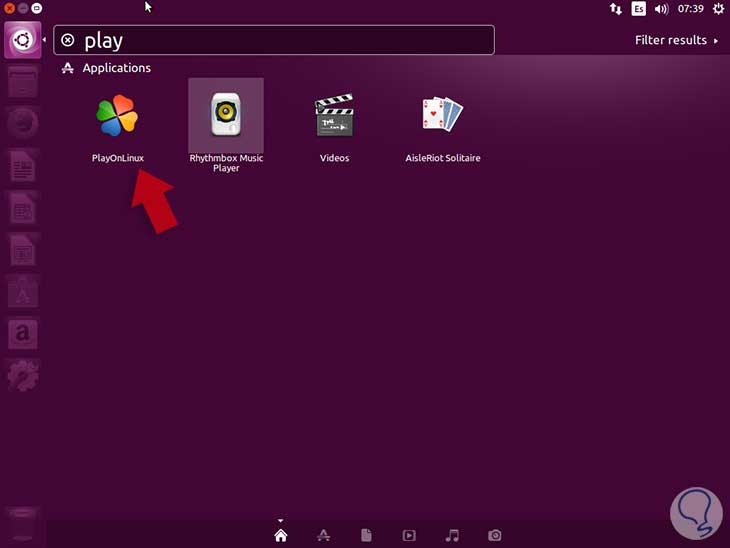 Una vez haya concluido el proceso de descarga e instalación de la herramienta podemos ingresar el termino playonlinux en el cuadro de búsqueda de Ubuntu 16 para ejecutar desde allí la aplicación: