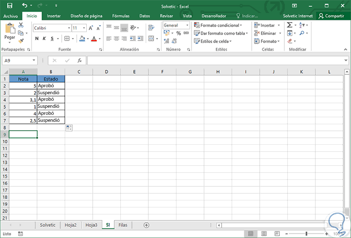 =SI(A2>3;"Aprobo";"Suspendio")Esto es la función SI de manera sencilla, ahora veremos cómo podemos usar esta función anidada en Excel 2016. Una función anidada implica añadir valores y condiciones a la fórmula.