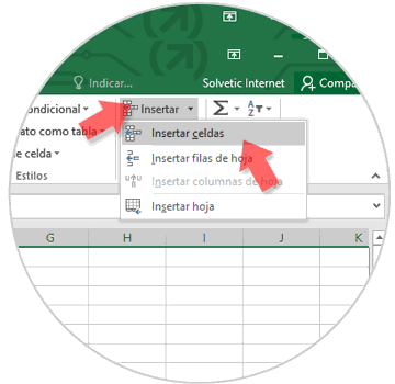 - Seleccionar una celda e ir a la pestaña Inicio, grupo Celdas y allí elegimos la opción Insertar / Insertar celdas.