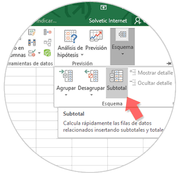 Para desplegar los resultados que deseamos vamos a ir a la ficha Datos, grupo Esquema y allí seleccionamos la opción Subtotal.