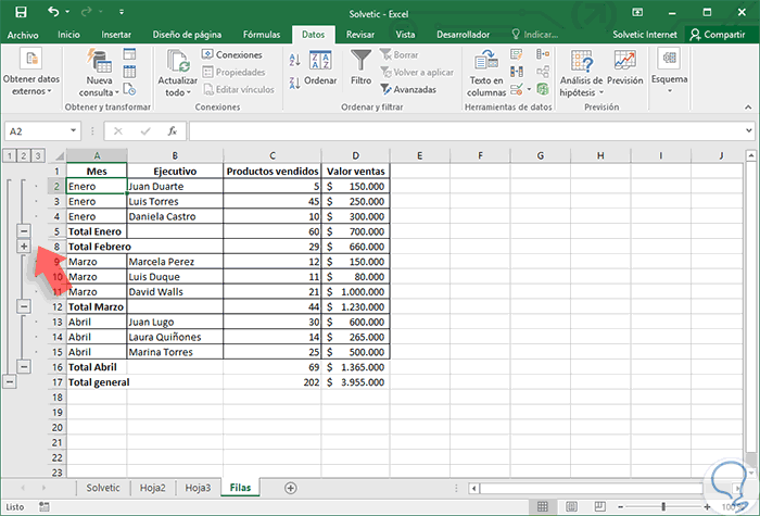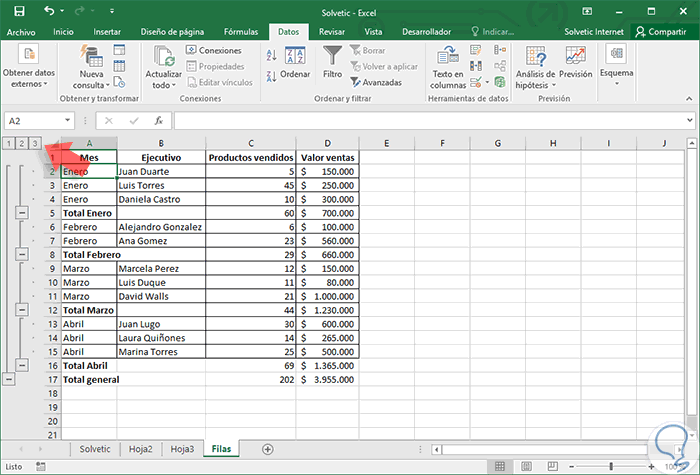 Podemos ver en el costado izquierdo una línea vertical con un símbolo -, si pulsamos sobre alguno de estos símbolos se colapsarán los grupos respectivos. Para volver a desplegar el grupo pulsaremos el símbolo +. Además de ello podemos visualizar en la parte superior los botones de nivel, que en este caso son 1,2 y 3. Cada uno de estos números indica un nivel de detalle de los datos.