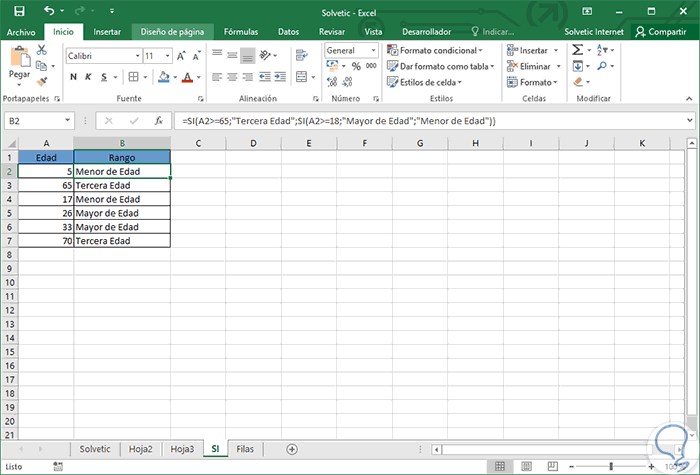=SI(A2>=65;"Tercera Edad";SI(A2>=18;"Mayor de Edad";"Menor de Edad"))