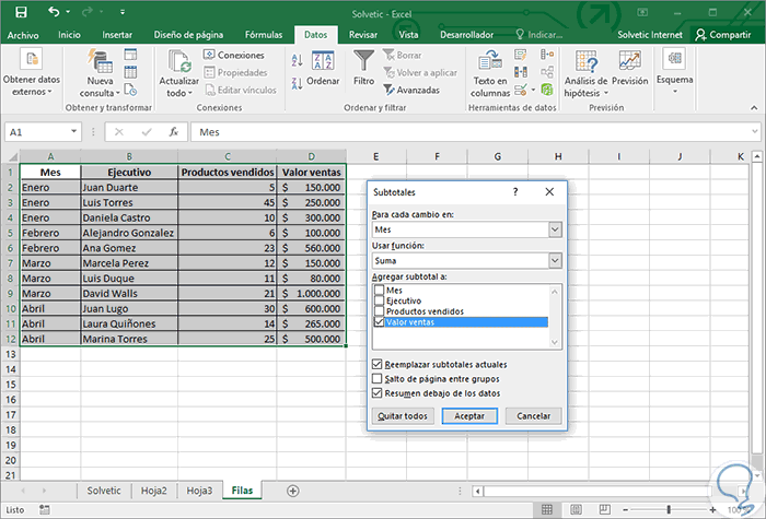 Una vez tengamos los subtotales creados manualmente vamos a ir a la siguiente ruta para hacer el agrupamiento manual: