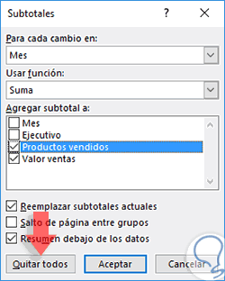 Para desagrupar las filas que hemos gestionado de forma automática en Excel 2016 debemos usar nuevamente la opción Subtotal del grupo Esquema. Allí seleccionamos la opción Quitar todos ubicada en la parte inferior. Esta opción dejara la hoja tal como la teníamos antes de efectuar la operación.