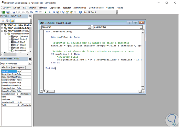 También es posible añadir filas usando macros, para ello debemos dar clic derecho sobre la hoja y seleccionar la opción Ver código. En la ventana desplegada ingresaremos el siguiente código: