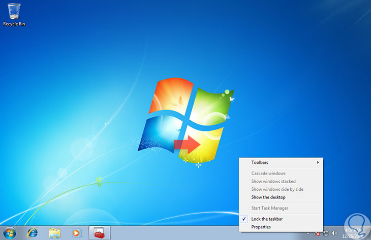 En Windows 7 podemos intentar acceder dando clic derecho sobre la barra de tareas y podemos ver que se encuentra deshabilitada la opción: