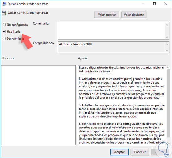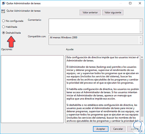 Usando alguna de estas opciones podremos deshabilitar o habilitar administrador de tareas Windows 10 con todas sus funcionalidades: