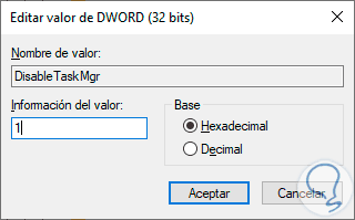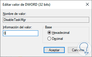 Aquí daremos un valor 0 u 1 en función de si queremos habilitar o deshabilitar el Administrador de tareas Windows 10.