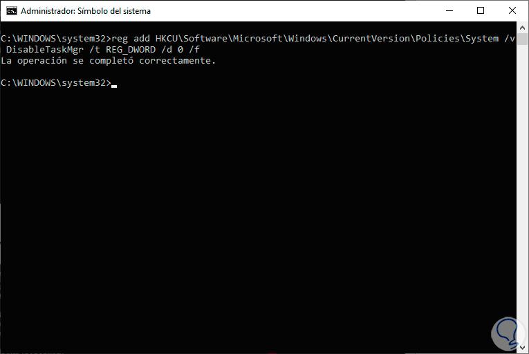 Ahora escribiremos el siguiente comando con valor o 1 en función de si queremos habilitar o deshabilitar Administrador de tareas Windows 10.