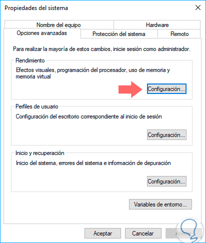 Sera desplegada la siguiente ventana donde vamos a la pestaña "Opciones avanzadas" y pulsaremos en el botón "Configuración" ubicado en el campo "Rendimiento":