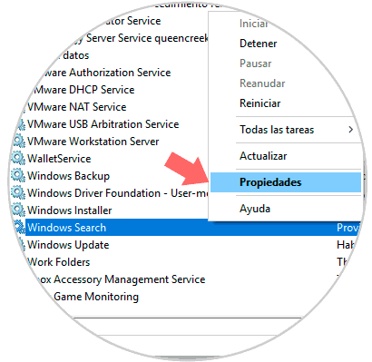 Pulsamos en "Aceptar" para acceder a los servicios de Windows 10. En la ventana desplegada ubicaremos el servicio "Windows Search", daremos clic derecho sobre él y seleccionamos "Propiedades":