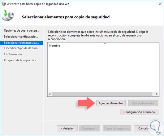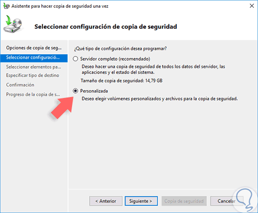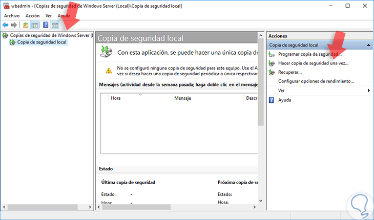 Al instalar la característica indicada podemos ir de nuevo al administrador del servidor y allí ir a "Herramientas / Copias de seguridad de Windows Server". Se desplegará el siguiente asistente: