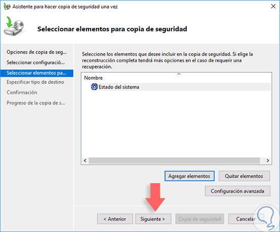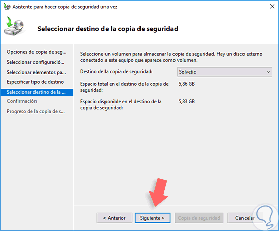 En este caso hemos elegido "Unidades locales" y pulsamos de nuevo en Siguiente y veremos la unidad donde se ha de almacenar la copia de seguridad de nuestro directorio activo.