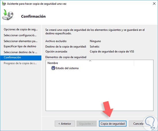 Una vez definido este parámetro pulsamos Siguiente y veremos un resumen de la tarea de respaldo del Directorio Activo que vamos a realizar.