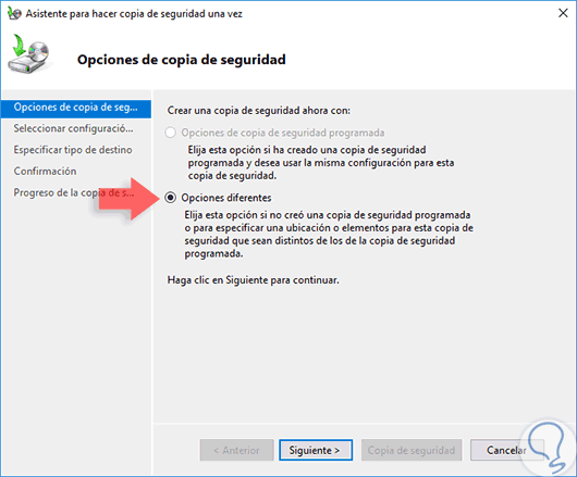 Pulsamos en Siguiente y a continuación debemos definir dónde queremos guardar la copia de respaldo, localmente o en alguna carpeta compartida, depende de nuestra necesidad.