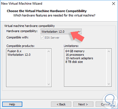 Pulsamos en Next y debemos asegurarnos que en el campo Hardware compatibility este la opción Workstation 12.0 para que cuente con las ultimas opciones de compatibilidad.