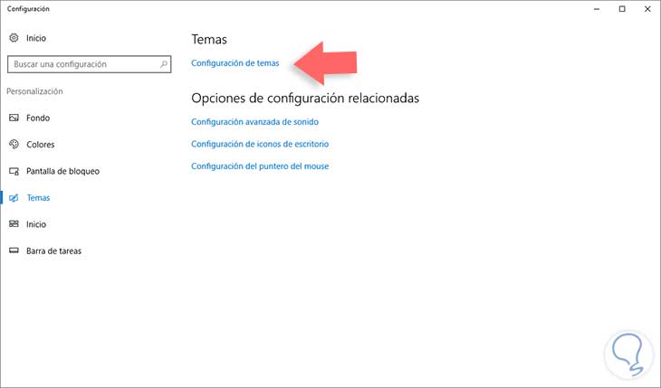 Se desplegará la siguiente ventana donde seleccionaremos la opción Temas y seguidamente Configuración de temas en el costado derecho.