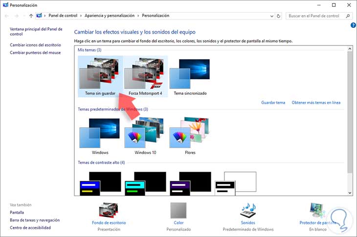 Allí seleccionamos el tema deseado y pulsamos en el botón Descargar. Una vez descargado el paquete de temas damos doble clic sobre el archivo para proceder con su instalación de manera automática. Podemos ver que se despliega la ventana de Personalización en Windows 10 con el nuevo tema que hemos descargado, en este caso Forza Motorsport 4: