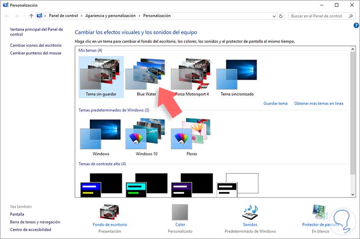 Se abrirá la siguiente ventana donde debemos seleccionar el nuevo tema para Windows 10, en este caso elegimos Blue Water