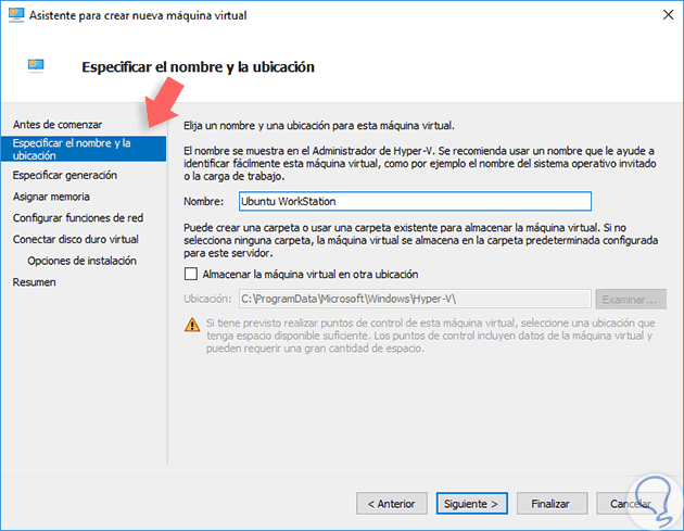 También podemos ejecutar esta acción desde el costado derecho en la opción Nuevo / Máquina virtual. Al usar esta opción se desplegará el siguiente asistente de Hyper-V donde en primer lugar definimos el nombre de la máquina virtual: