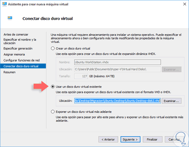 Debemos tener cuidado en este punto, Conectar disco duro virtual, ya que acá será necesario activar la casilla Usar un disco duro virtual existente y allí ir a la ruta donde hemos almacenado la imagen convertida.