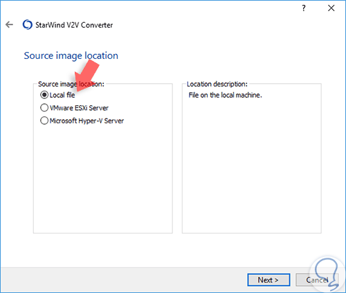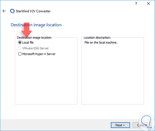 Pulsamos en Siguiente y en la siguiente ventana dejamos la opción por defecto Local file ya que allí almacenaremos el disco duro virtual.