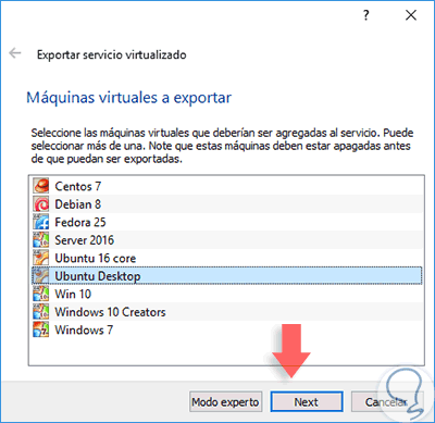Una vez pulsemos en esta opción veremos la siguiente ventana donde debemos seleccionar la máquina virtual a exportar.