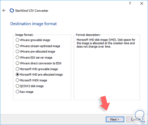 Pulsamos en Next y a continuación debemos definir el formato de imagen que deseamos convertir, recordemos que Hyper-V soporta las siguientes. La ventaja de VHDX es que esta soporta hasta 64 TB de almacenamiento.
