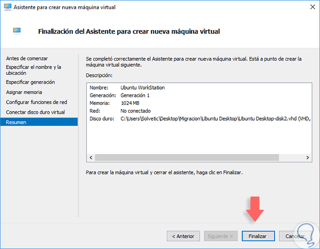 Pulsamos en Siguiente y veremos un resumen de la máquina virtual a crear.